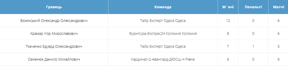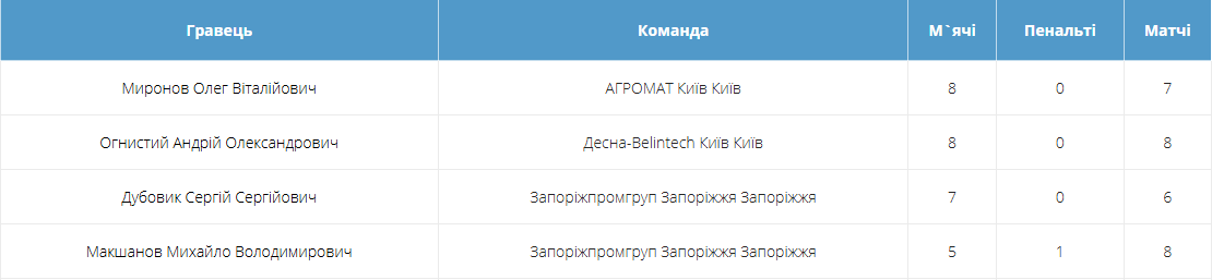 Голи: Кузик (40) – Божинський (2, 5, 11, 30, 35), Бральчук (10, 32)