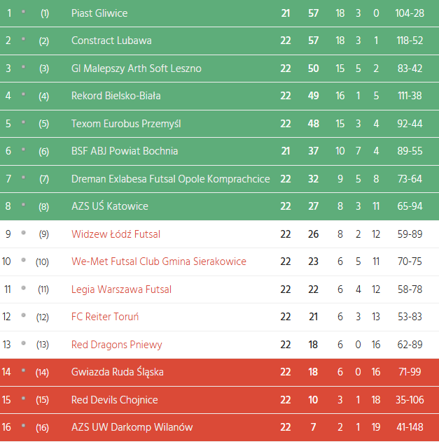 Турнірна таблиця чемпіонату Польщі після двадцять другого туру.