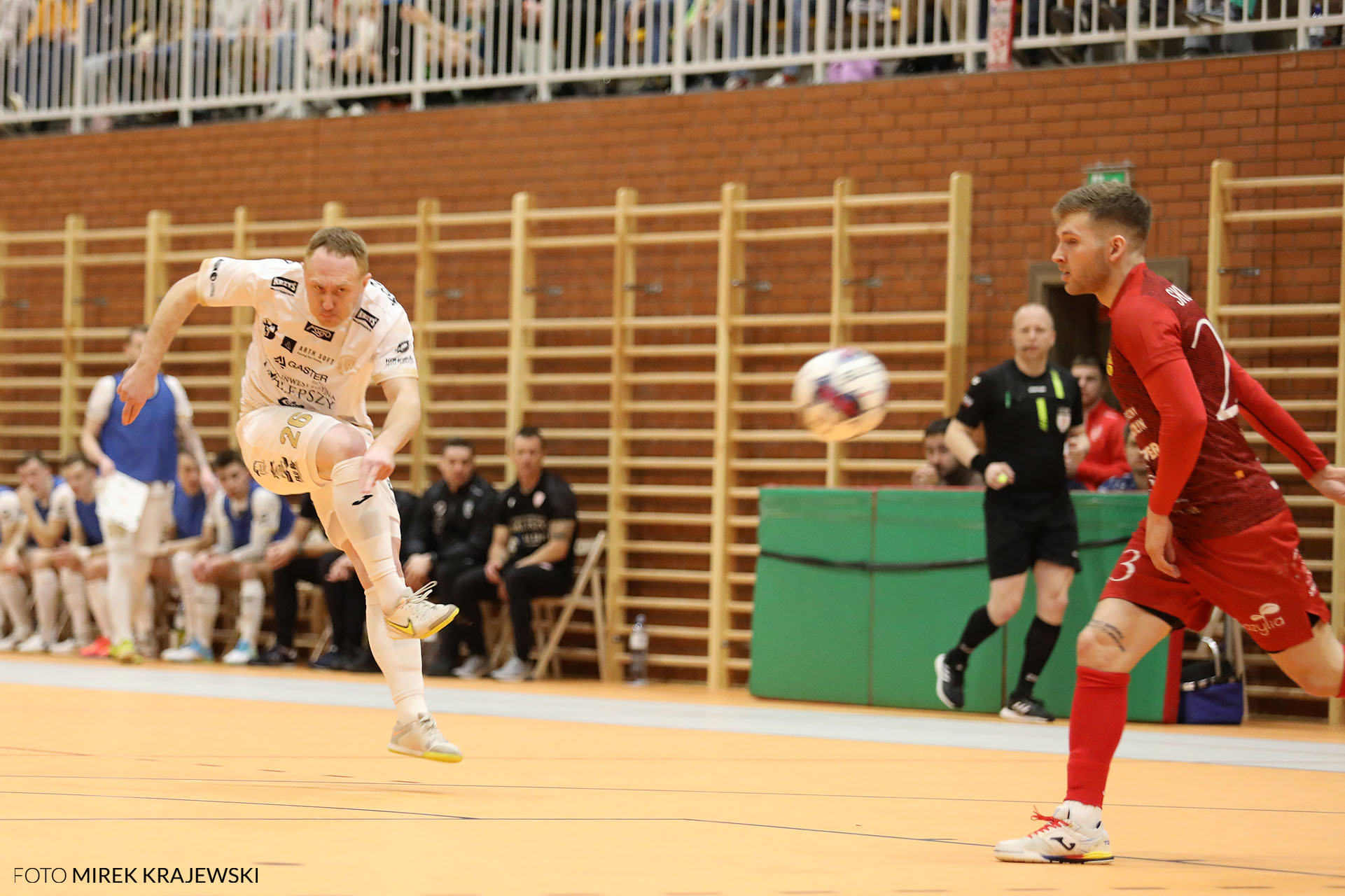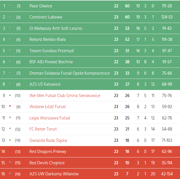 У чемпіонаті Польщі серед команд ФОГО Екстракласи відбулись матчі двадцять третього туру. І хоча його центральним поєдинком можна вважати протистояння у Катовіце, де команда Шльонського Університету, за яку виступає Сергій Лапа, грала проти «Євробуса», кольори якого захищають Артем Фаренюк, Назар Швед, Даниїл Абакшин, Ярослав Лебідь, Григорій Занько та Роман Колток, але ми виділимо матч у Вілковіце. Саме там, на арені, яка функціонує менше року, у рамках цього туру проводив свій домашній матч «Футзал Лешно» з Артемом Росем, В’ячеславом Кожемякою, Сергієм Малишком та Євгеном Козловим. Річ у тім, що основна арена лешнян – «Трапез» – була в той день зайнятою. Тим не менш, зміна арени не вплинула на настрій номінальних господарів майданчику, які розгромили «Ред Девілз» з Павлом Пучкою, Олегом Негелою, Андрієм Єлішевим, Владиславом Ткаченком, Павлом Скубченком у складі та Олегом Зозулею на тренерському містку. Рахунок 8:0 на користь «Футзал Лешно» красномовно свідчить про настрої лешнян. Відзначимо, що хет-триком у цій грі відзначився Артем Рось, який, до того ж, віддав ще одну гольову передачу. А ось у складі «червоних дияволів» негативно відзначився Павло Скубченко, який отримав дві жовті картки, а разом з ними – червону.