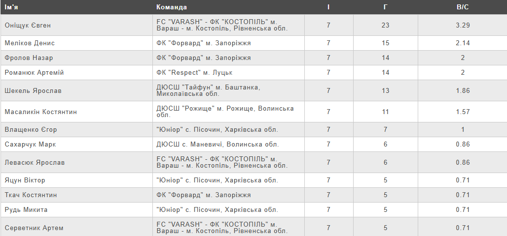 Найкращий бомбардир – Євген Оніщук (ФК «VARASH» /ФК «Костопіль»), 23 голи;