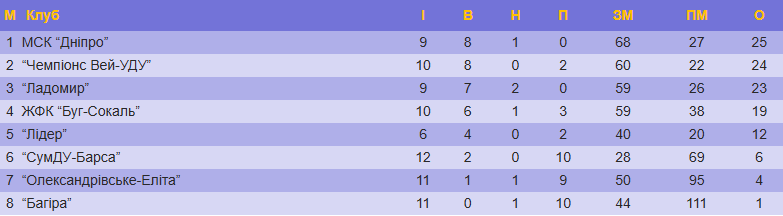 Поточна турнірна таблиця «чемпіонської» групи чемпіонату України серед жінок.