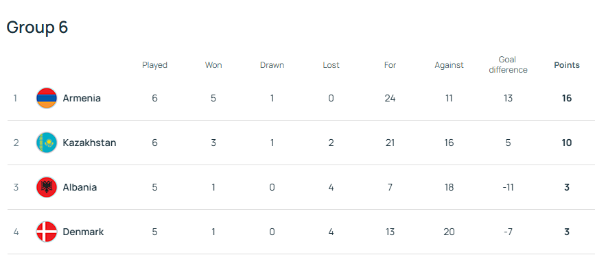 Збірна Вірменії у «лобовому» протистоянні перемогла збірну Казахстану та вперше в історії вийшла до фінальної частини чемпіонату Європи з футзалу. Відповідно, Казахстан фінішував другим у групі 6, і тепер зіграє у плей-оф. Зазначимо, що у цій групі залишився лише один матч, який буде зіграний у квітні. Але фактично протистояння між збірними Данії та Албанії вже не матиме турнірного значення.