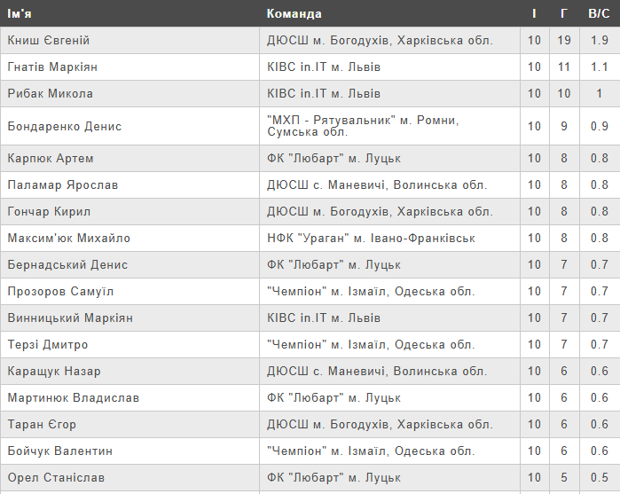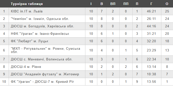 Турнірна таблиця чемпіонату України (U-15) після десятого туру.
