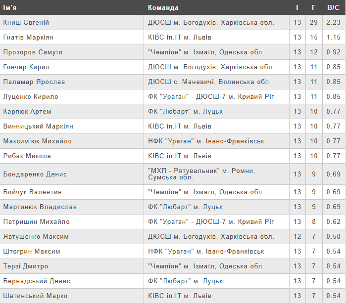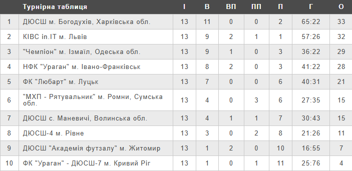 Турнірна таблиця чемпіонату України (U-15) після тринадцятого туру.
