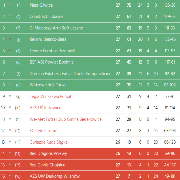 Турнірна таблиця чемпіонату Польщі після двадцять сьомого туру.
