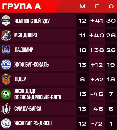 Поточна турнірна таблиця у «чемпіонській» групі чемпіонату України серед жінок.