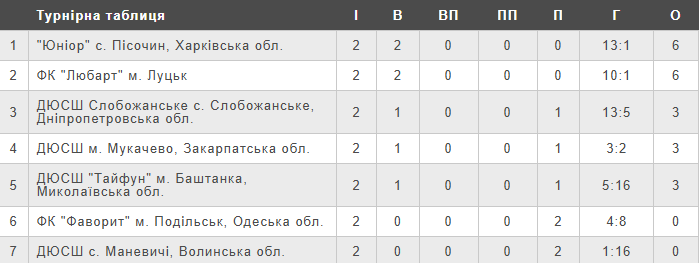 Турнірна таблиця першого ігрового дня розіграшу Кубку України (U-8).