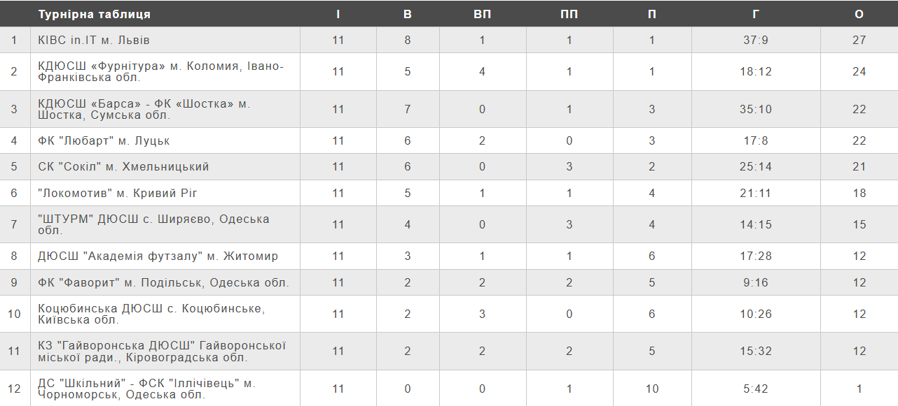 Підсумкова турнірна таблиця чемпіонату України (U-14).