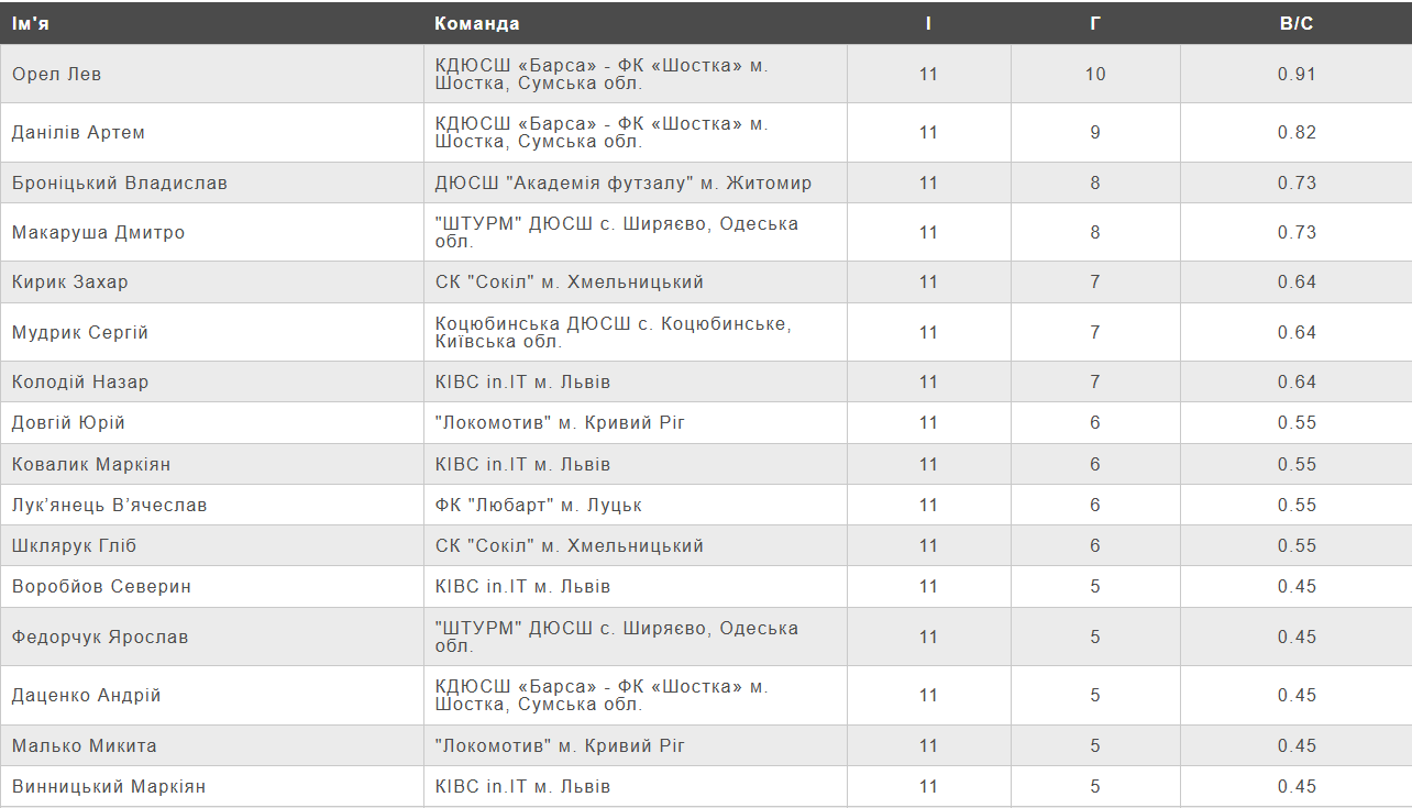 Найкращий бомбардир – Лев Орел (КДЮСШ «Барса»), 10 голів.