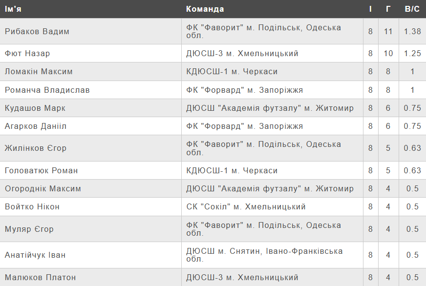 Підсумкова турнірна таблиця першого етапу чемпіонату України (U-10) серед команд Вищої ліги.