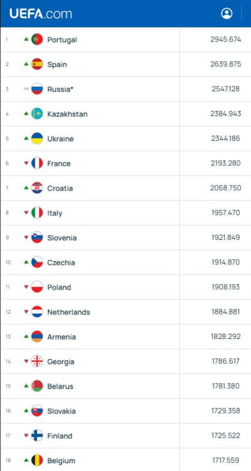 Після матчів раунду плей-оф кваліфікації Євро-2026 вийшов оновлений рейтинг УЄФА. І цей оновлений рейтинг є дуже важливим для збірної України, яка внаслідок невиходу збірної Казахстану на чемпіонат Європи майже наздогнала підопічних Кака. Відповідно, в разі успішного виступу збірної України на Євро-2026 вона цілком реально зможе обійти Казахстан у рейтингу УЄФА та вийти на четверте місце у європейському табелі про ранги. А якщо не враховувати росіян, то українська збірна взагалі може опинитись на третій позиції.