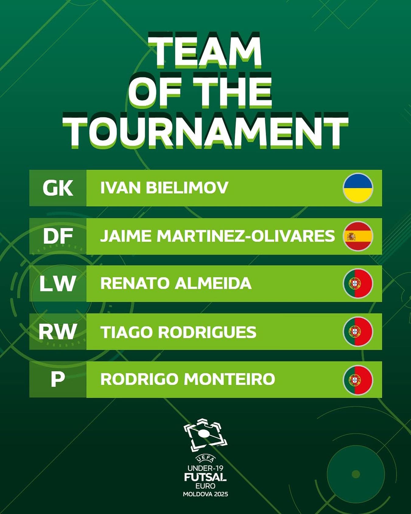 Зазначимо, що до топ-5 найкращих гравців Євро-2025 (U-19), який проходив з 28 вересня по 5 жовтня у Молдові, увійшли також іспанець Хайме Мартінес-Оліварес, а також португальці Ренато Алмейда, Тьяго Родрігеш та Родріго Монтейру, який був вишнаний найкращим гравцем цьогорічного юніорського Євро.