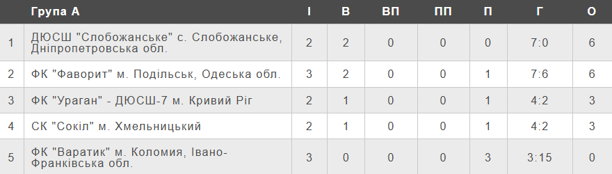 За підсумками першого ігрового дня одразу три команди – ДЮСШ «Слобожанське», «ZP Group» та ДЮСШ (Мукачево) – здобули на старті турніру дві перемоги з двох можливих. Також дві перемоги здобув подільський «Фаворит», але при цьому він зазнав однієї поразки – від хмельницького «Сокола».