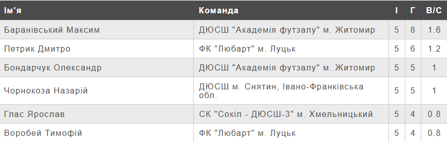 Голи: Андрійчук (12), Фещенко (18), Романюк (20), Хринюк (26), Сахнюк (26), Березнюк (28) – Водак (22)