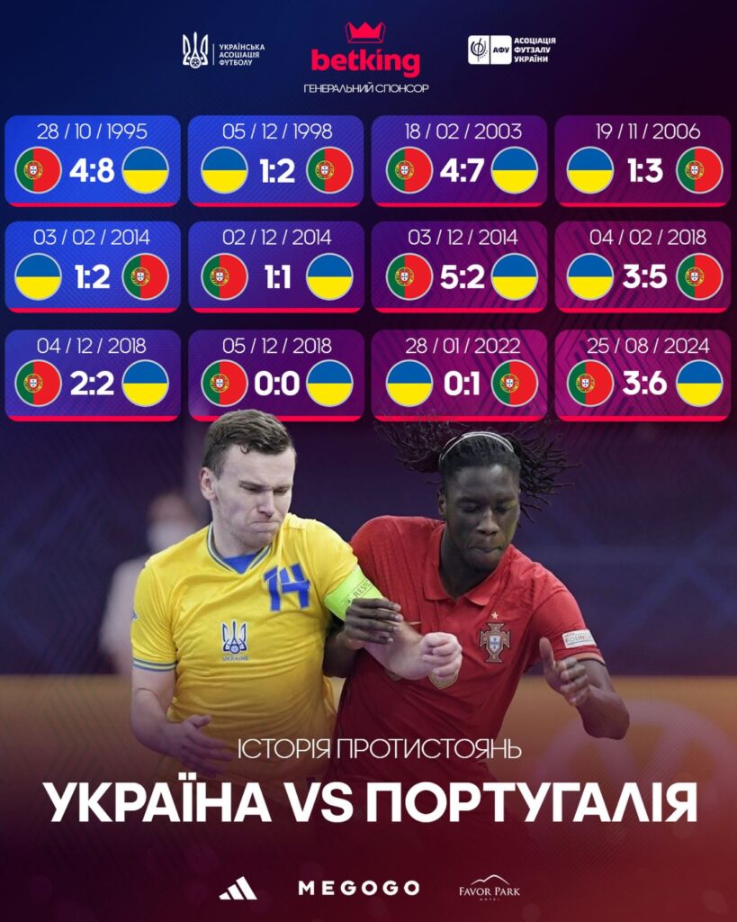 Національна збірна України з футзалу продовжує підготовку до Євро-2026. Найближчлшл вікенду 19 та 21 грудня бронзові призери ЧС-2024 проведуть два товариські матчі проти чинних чемпіонів Європи – Португалії. До цього суперники зутрічалися між собою 12 разів, і за статистткою перевага на боці португальців – 6 перемог, 3 нічиї і 3 поразки.