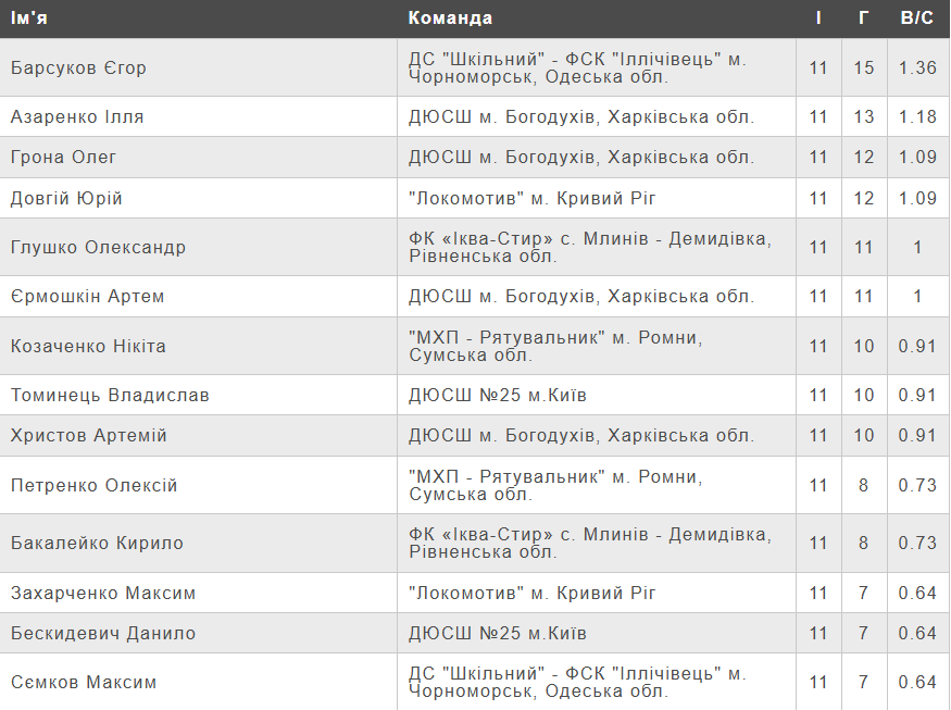 Турнірна таблиця чемпіонату України (U-15) серед команд Першої ліги після другого з’їзного кола.