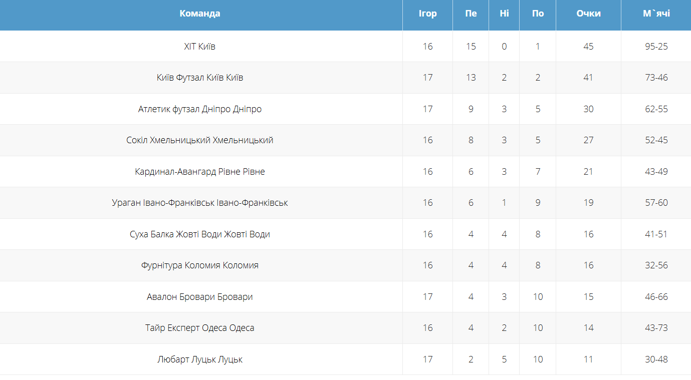 Поточна турнірна таблиця чемпіонату України серед команд betking Екстра-ліги.
