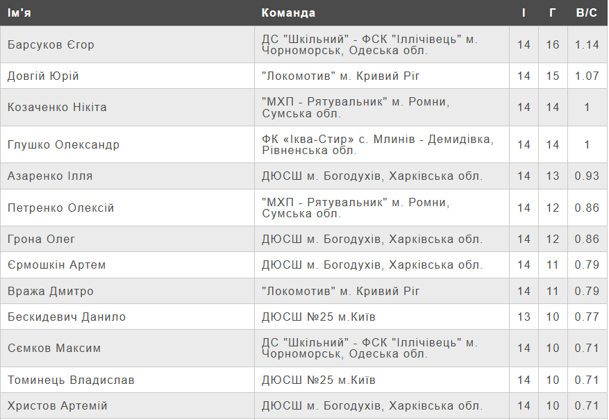Підсумкова турнірна таблиця першого етапу чемпіонату України (U-15) серед команд Першої ліги.