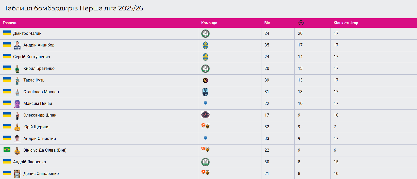 Турнірна таблиця чемпіонату України серед команд Першої ліги після двадцятого туру.