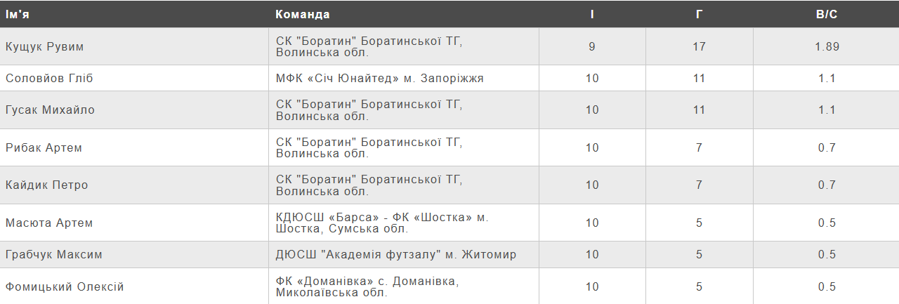Найкращий бомбардир – Рувим Кущук (СК «Боратин»), 17 голів.