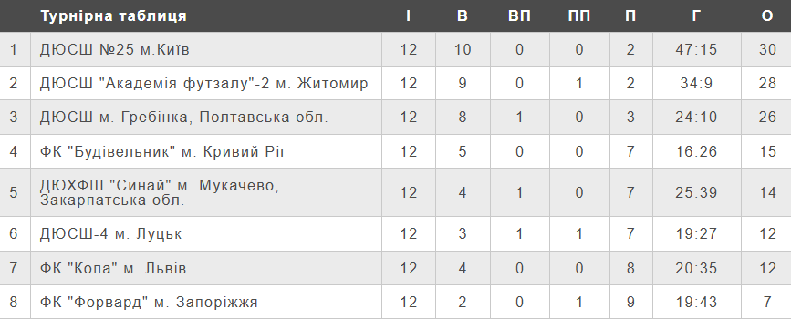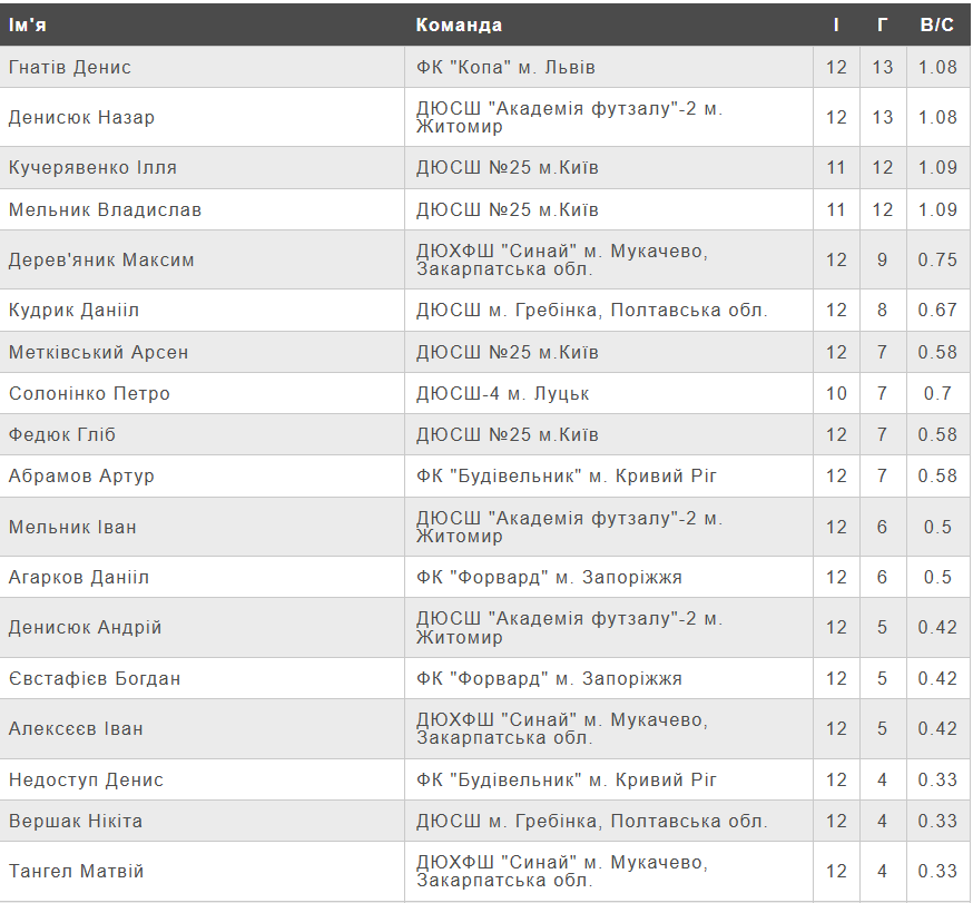 Турнірна таблиця чемпіонату України (U-13) серед команд Першої ліги після дванадцятого туру.